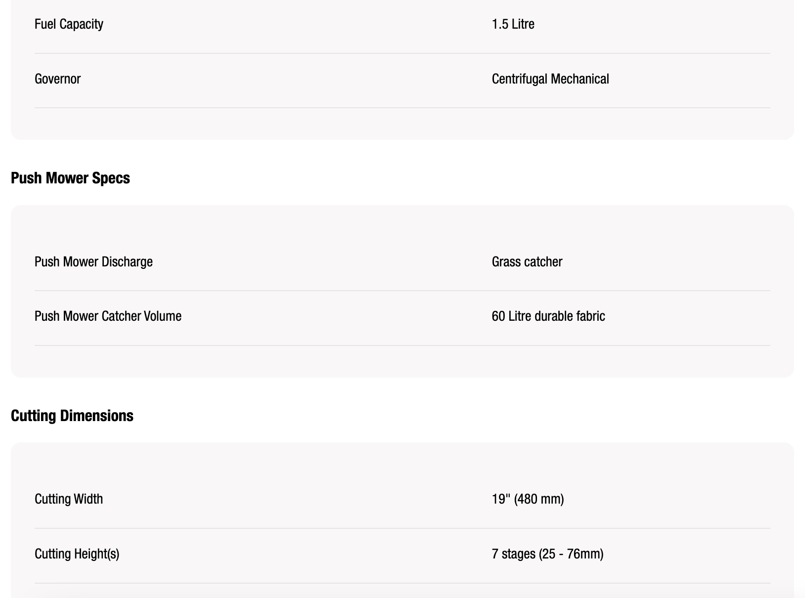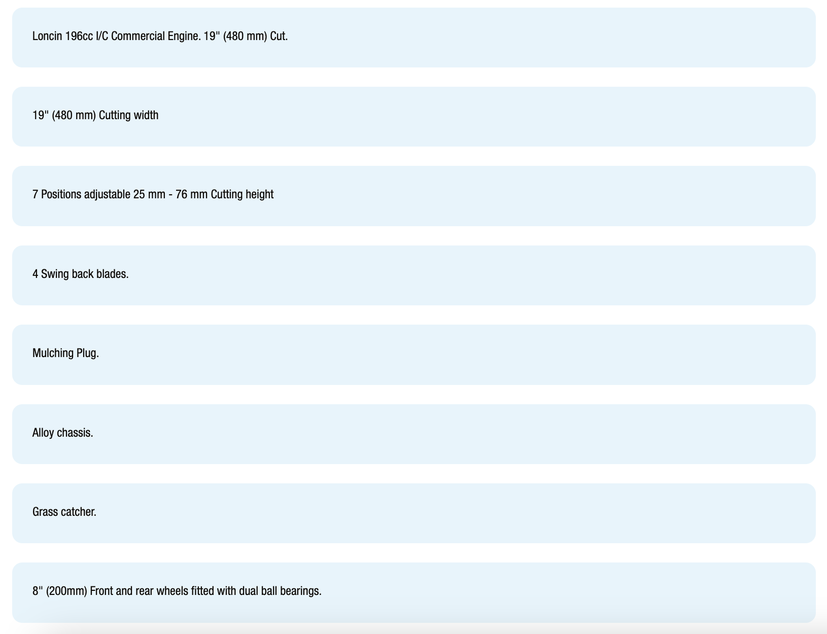 These push mowers are powered by a Loncin 196cc I/C commercial engine which provides ample power for highly efficient performance. The mower's aluminum chassis have a perfect aerodynamic design. These machines have a 48 cm working width and 7 levels height adjustment from 25 to 76 mm.